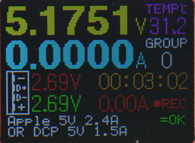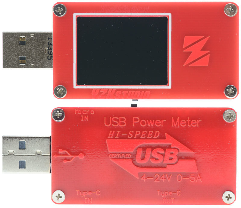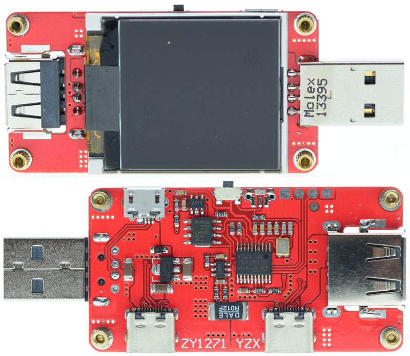ZY1271是基於ZY1270進行修改,改變配色及開機畫面,取消原本內建的充電加速輸出埠,並加上兩組Type-C插座,用來對應目前越來越多的Typc-C電源及設備,雖有一進一出兩組Type-C插座,但搭配USB PD規格的充電器/行動電源,仍需要連接負載才可正常測量電壓電流,選用的雙頭Type-C連接線及插入的正反方向也是要特別注意,Type-C信號部分ZY1271仍只擷取D+/D-電壓,未偵測CC1/CC2,尚未十分完備