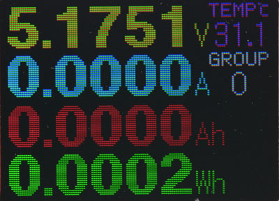 第一功能畫面,顯示電壓/電流/容量/電量/溫度/數據組,長按功能開關可切換數據組,持續長按更久可清除目前數據組