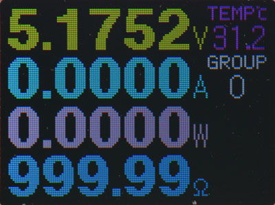 第二功能畫面,顯示電壓/電流/功率/等效阻抗/溫度/數據組,長按功能開關可切換數據組,持續長按更久可清除目前數據組