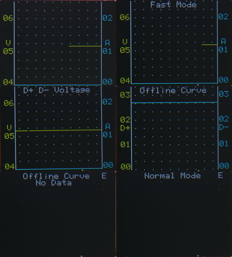 第五功能畫面-曲線繪製功能,長按功能開關可在電壓/電流曲線正常模式、電壓/電流曲線快速繪製模式、D+/D-電壓曲線、離線曲線等模式進行切換,在正常模式以外的模式下短按功能開關可暫停曲線繪製(右上角會顯示”P”字)