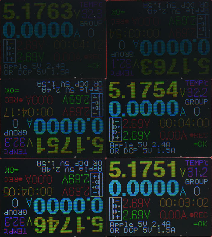 第四功能畫面,顯示電壓/電流/溫度/數據組/D+/D-/累計時間/電流門檻值/充電定義辨識等資訊