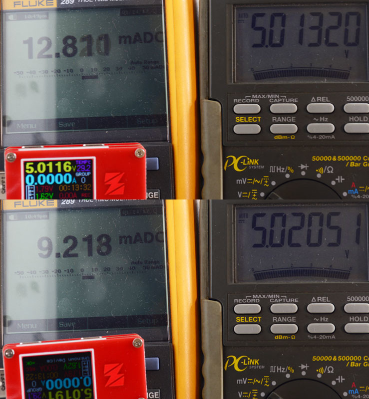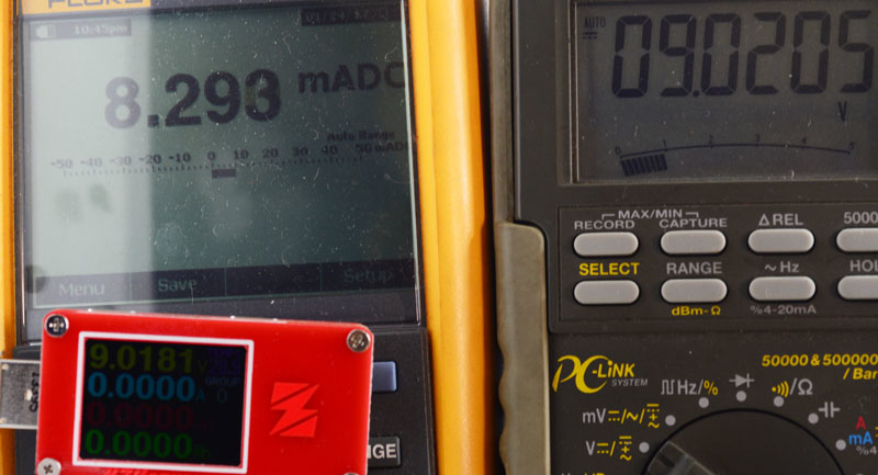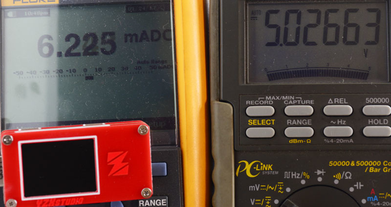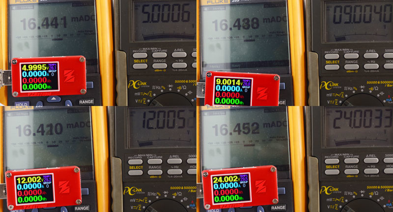 測試通入5V/9V/12V/24V四種電壓,觀察ZY1271顯示的電壓數值與消耗電流,電壓顯示偏差在1.1mV至3mV之間,預設亮度下消耗電流在16.4mA左右,不會隨著輸入電壓變動而改變