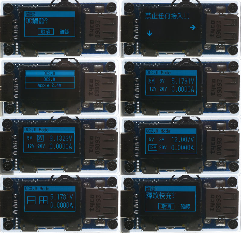 QC2.0模式中可用滾輪左右鍵選擇5V/9V/12V/20V,短按滾輪中鍵便啟動該組觸發,QC3.0模式中直接用滾輪左右鍵來升降電壓,右邊會顯示目前電壓及電流