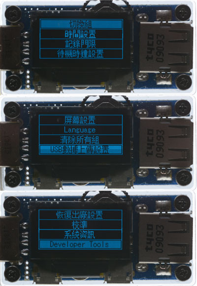 Kotomi多功能OLED USB電壓電流表精度優良,量測畫面顯示數值刷新速率快(主界面下達0.15秒/次),自身功耗小,可減小對待測設備測量造成的誤差;具備QC2.0/3.0快充觸發功能、MicroUSB線阻測試、快速充電識別,閒置時待機畫面也可以當作電子鐘使用;韌體升級不需要燒錄器或刷機線;三段滾輪按鈕,設定操作簡便,操作介面並提供英文/日文/繁體中文/簡體中文可選擇