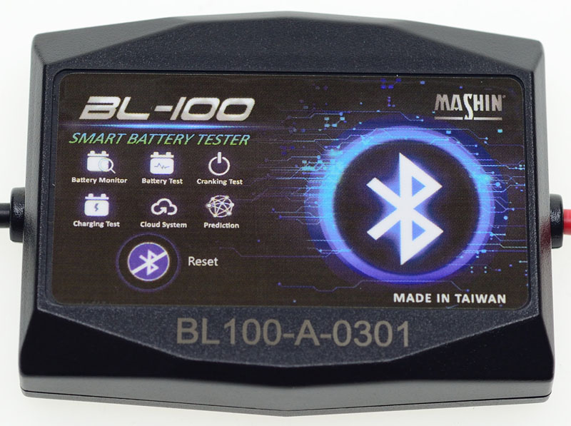 本體正面彩色貼紙印有BL-100 SMART BATTERY TESTER、功能特色圖示、藍芽圖示及產地,下方外殼有雷射刻印序號,畫斜線的藍芽圖示是RESET按鍵,按住三秒可重設藍芽連線