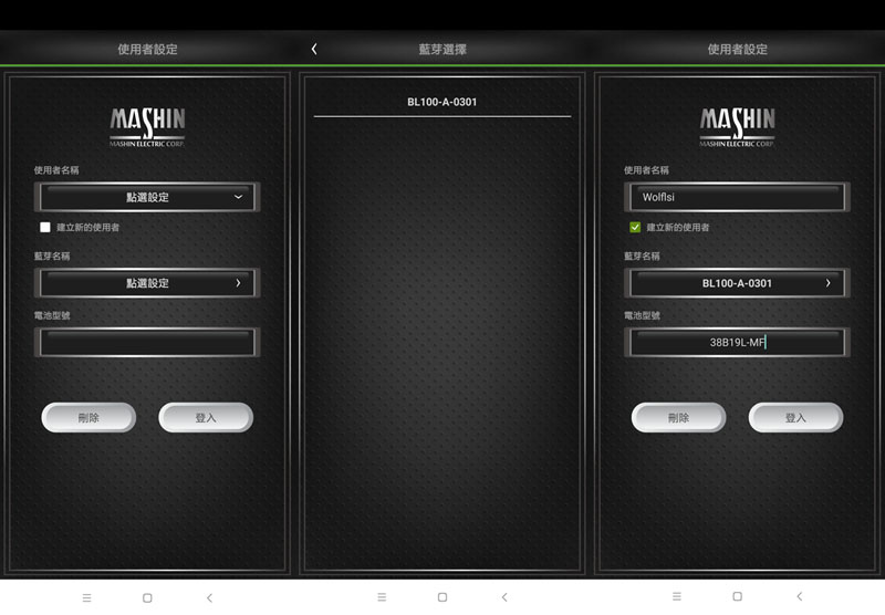 進入APP後,首先登錄使用者,選擇連接的BL-100藍芽裝置名稱(名稱也會印在本體上方),輸入電池型號,登錄過的使用者會儲存在手機上