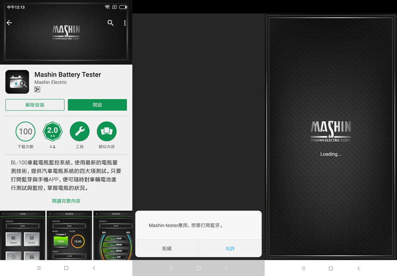 之後在智慧型手機上安裝Mashin Battery Tester,安裝完成後第一次啟動會詢問是否打開藍芽,點選”允許”,然後就會顯示載入中畫面
