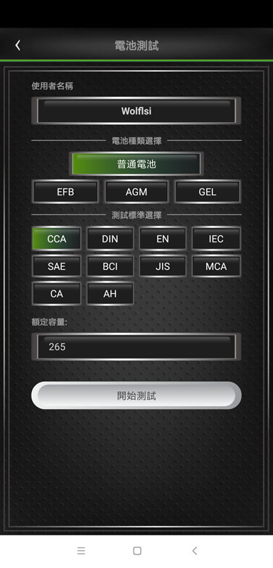 測量設定畫面,可選擇電池種類(普通加水/低保養/免保養電池;EFB充電制御電池;AGM;GEL膠體電池)、測試標準選擇(CCA/DIN/EN/IEC/SAE/BCI/JIS/MCA/CA/AH)、額定容量(使用者依照目前車上所裝電池上面的標示來輸入,或是查詢說明書後方標準電池對照表格)