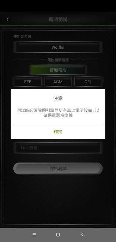 可量測電池CCA/內阻/SOC/SOH數據,方便掌握電池健康狀態。進入時會提示使用者測試時必須關閉所有車上電子/電器設備,以確保量測精準性,之後按下”確定”進入測量設定畫面