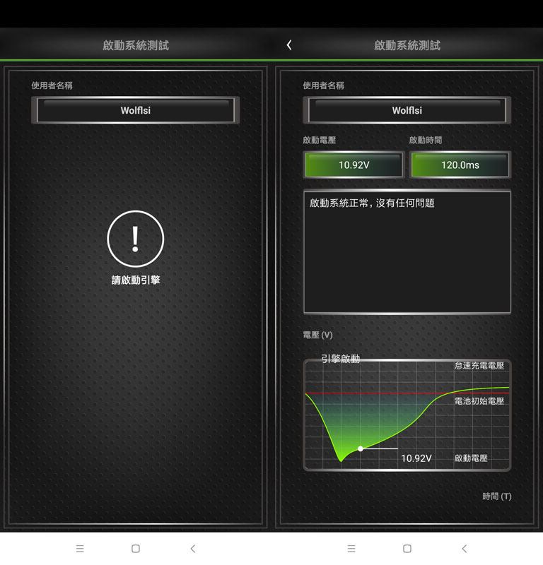 一般啟動電壓要大於9.6V,9.6V以下表示不正常,中央訊息框顯示系統判定的測試結果,下方顯示啟動系統測試過程中的電壓曲線