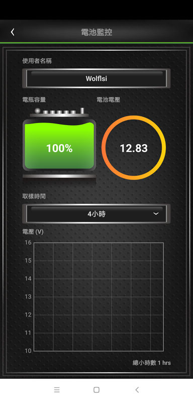 可顯示目前電池容量及電池電壓,下方可設定2/4/6/8小時取樣時間(藍芽測試器將會於設定時間自動儲存數據),並繪製電壓取樣圖表