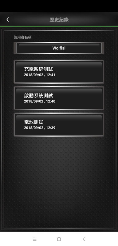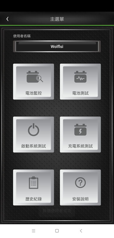 主選單,上方有使用者名稱,下方為六個功能鍵,分別是電池監控、電池測試、啟動系統測試、充電系統測試、歷史紀錄、安裝說明
