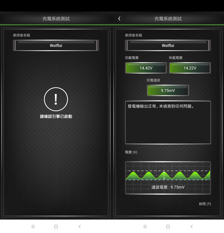 量測分析充電系統,取得發電機空載電壓、有載電壓及充電漣波,並提供充電系統狀態說明。進入功能後APP將顯示”請確認引擎已啟動”,這時維持發動不要關閉引擎,並確保車上所有電子/電器設備都處於關閉狀態,如果測試中未關閉電子/電器設備,將會影響測試結果,測試完成後會顯示空載電壓、有載電壓、充電漣波,中央訊息框顯示系統判定的測試結果,下方顯示充電漣波曲線