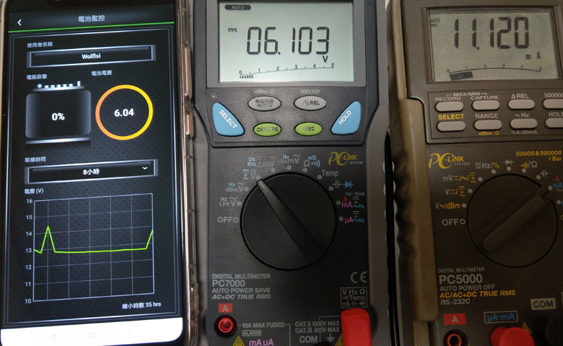 電壓誤差與電表比較,與中央電表顯示值比較起來,BL-100顯示值(左邊手機畫面)略低0.07V