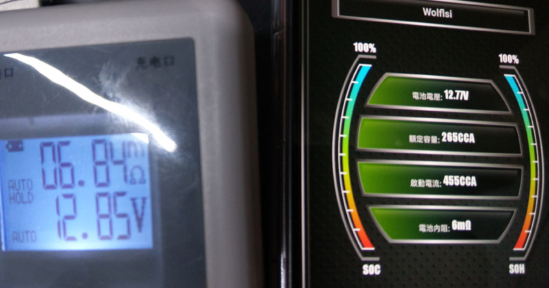 內阻準確度,內阻計(左)顯示6.84mΩ,BL-100(右)顯示6mΩ