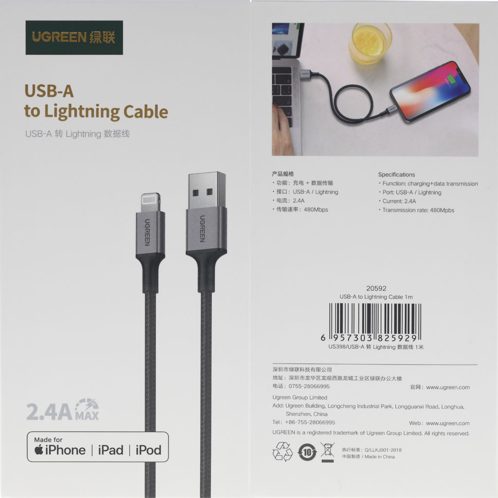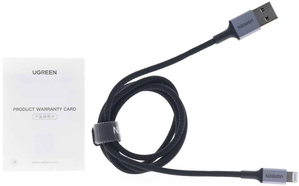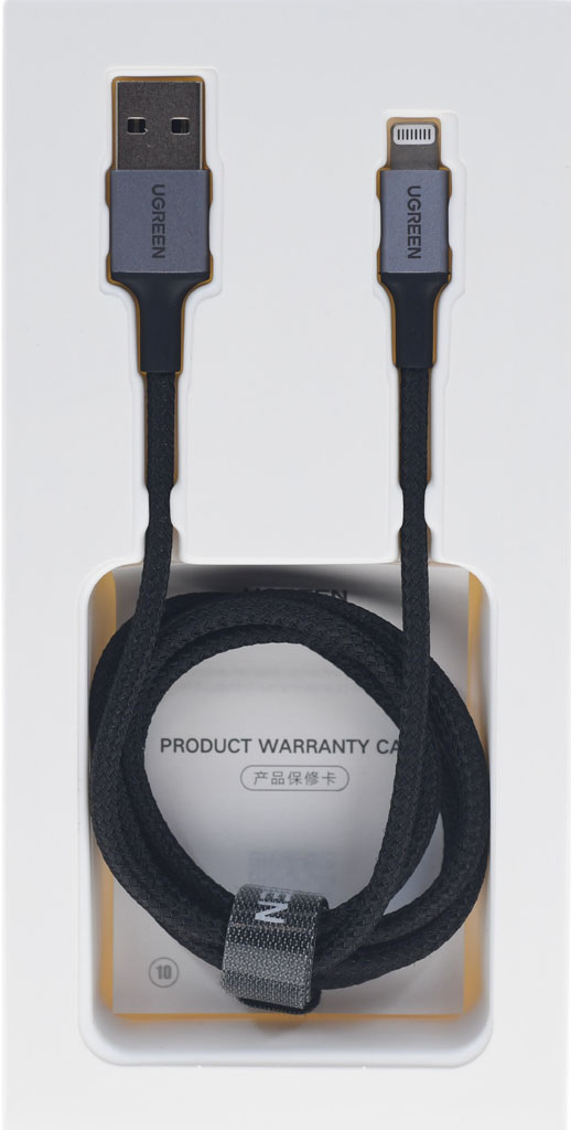 ▼包裝內容有UGREEN綠聯 A to Lightning防彈纖維鎧甲版充電傳輸線及保固卡