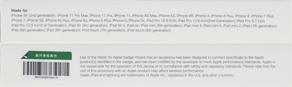 ▼外盒左右側面有適用機型、真偽查驗條碼標籤、Apple MFi認證說明