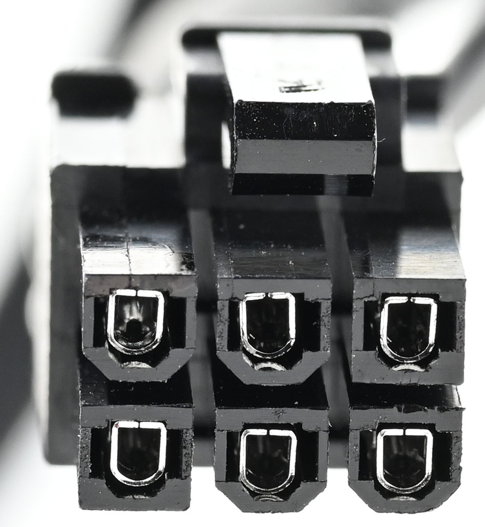 ▼這種模組化線材,線路部分使用16AWG,一端為顯示卡端12Pin Micro-fit 3.0插頭,一端為電源端2個8P插頭,規格上每條12V線路可以走9A,6條共可走54A,耐插拔次數25次
