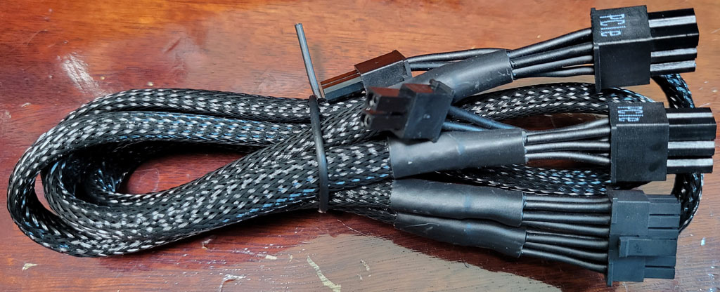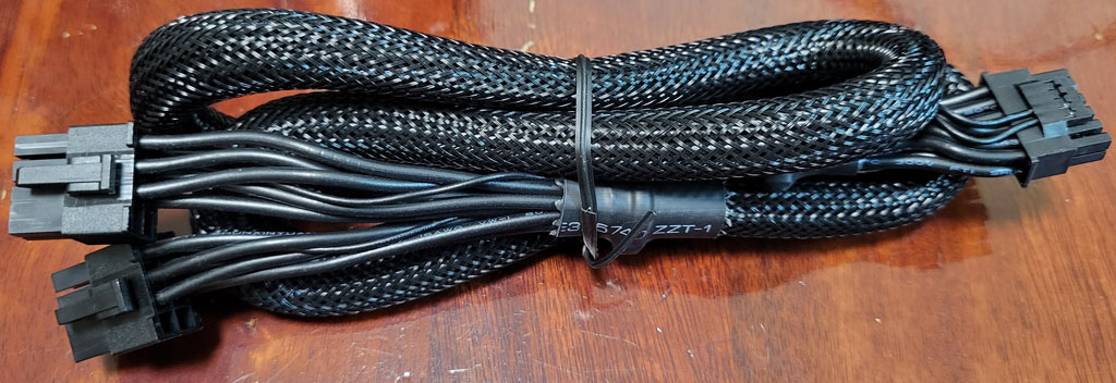 ▼轉接線實際接線圖,每個8P插座之間用2條(1條+12V,1條GND)14AWG黑色線連接至12VHPWR插頭,12VHPWR插頭端內部+12V(Pin1-Pin6)並聯,GND(Pin7-Pin12)並聯,插頭尾端設置防止金屬連接器被退出的固定蓋,並在6條14AWG線路處封膠進行強化。S1(CARD_PWR_STABLE)及S2(CARD_CBL_PRES#)空接未使用,在其中1個PCIE 8P插座內設置電路,將另外2個PCIE 8P插座的Sense B(Pin4)接過來,當3個PCIE 8P的Sense B(Pin4)都正常連接時,才會將12VHPWR的S3(Sense 0)及S4(Sense 1)調整至450W組態,這時顯卡才會正常啟動。若PCIE 8P接頭沒有正常連接(空著沒插或是插了PCIE 6P),S3/S4未正常配置下顯卡不會啟動