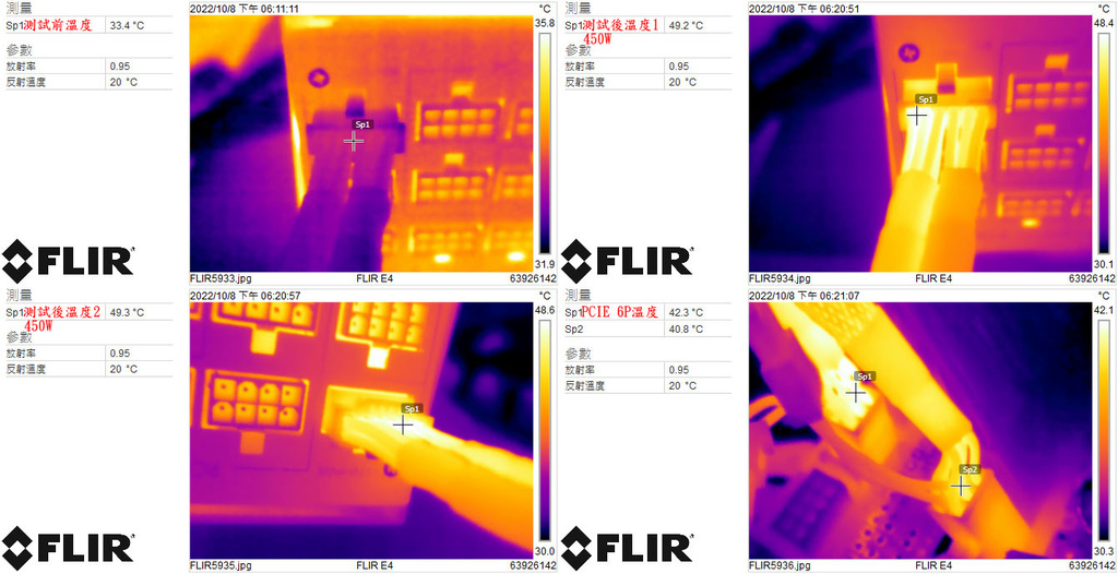 ▼電源供應器端12VHPWR走10分鐘12V/37.5A(450W)的溫度前後比較。10分鐘後12VHPWR插頭溫度最高49.3度