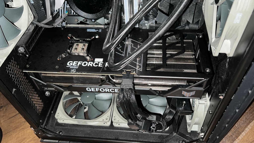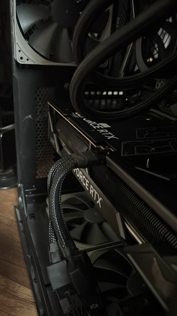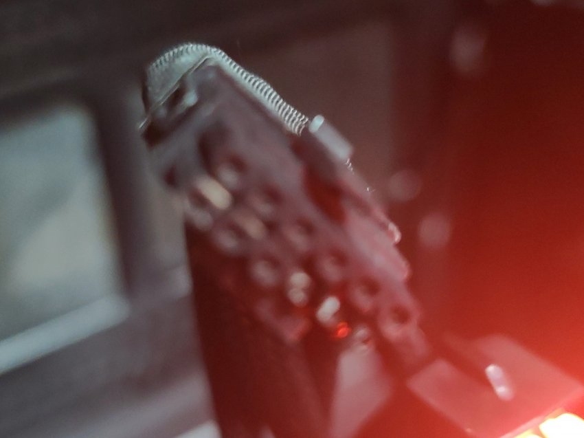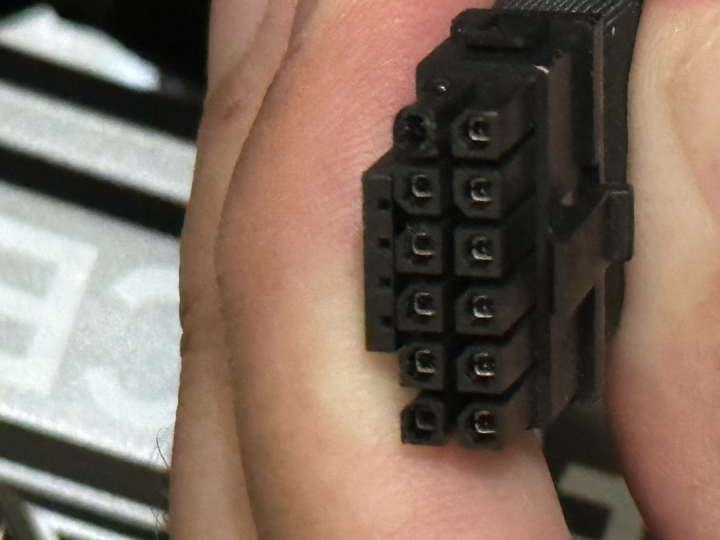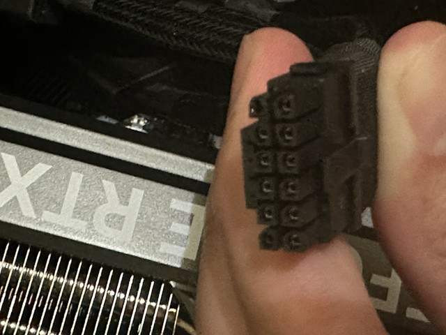 ▼組裝完的照片及燒毀的轉接線12VHPWR插頭,從組裝照片可看到,轉接線下垂,與從背板拉出的PCIE電源線相接,從顯卡外觀布局來看,應該是ASUS TUF Gaming GEFORCE RTX 4090 OC Edition。燒毀插頭的照片沒有拍得很近,不過從卡榫位置可以得知受損區域同樣集中在負責傳遞12V電流的Pin1至Pin6