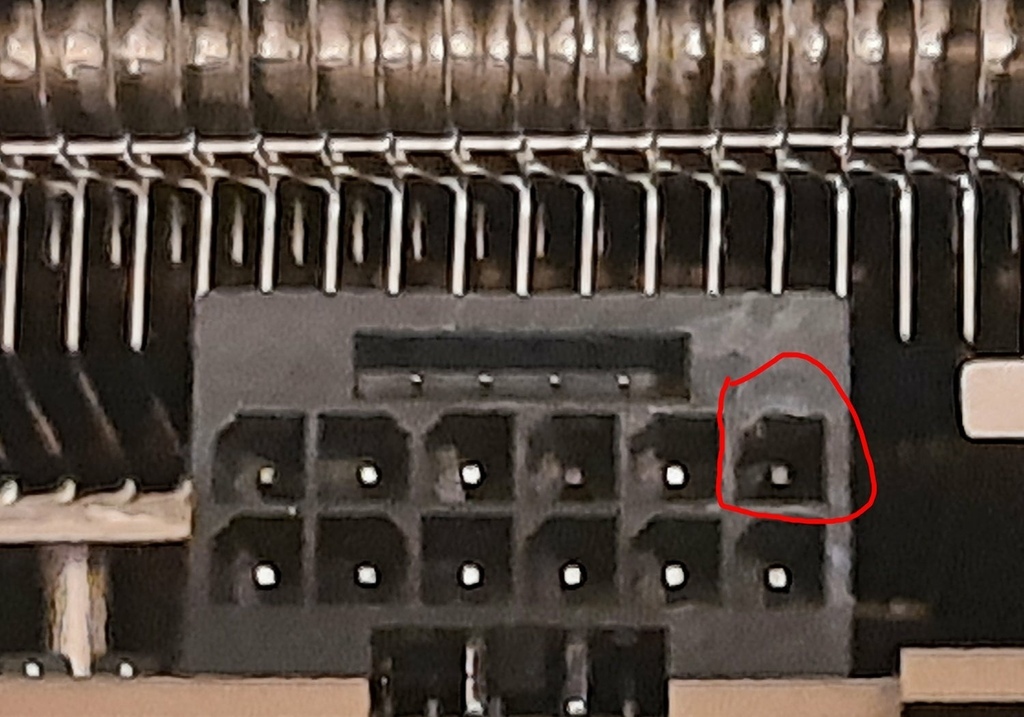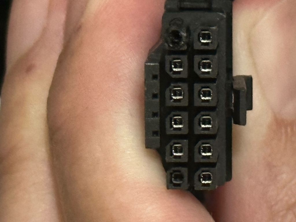 ▼燒毀的顯示卡12VHPWR插座近照,燒毀處集中在負責傳遞12V電流的Pin1至Pin6