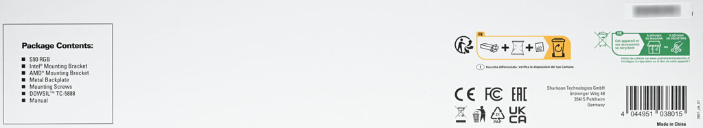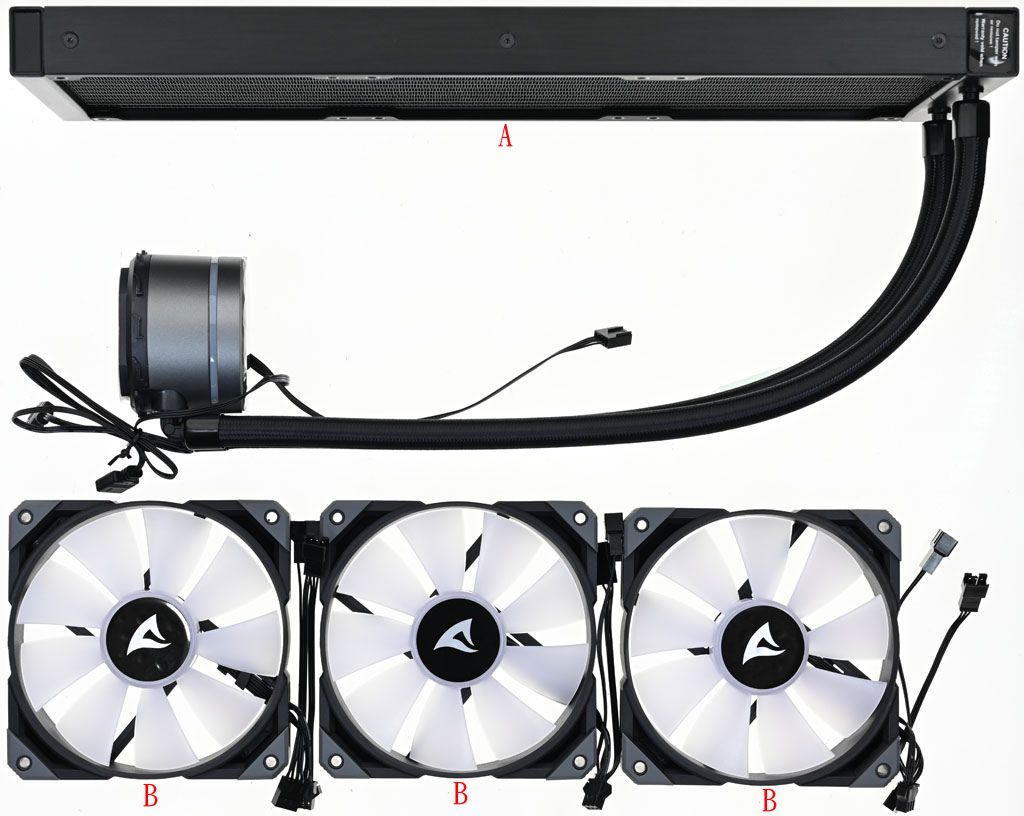 ▼包裝內容物有Sharkoon S90 RGB一體式水冷散熱器(A)、3顆幻彩RGB PWM風扇(B)