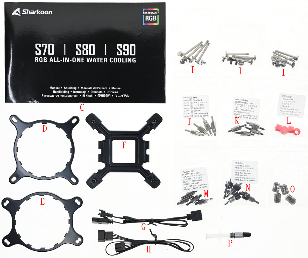 ▼安裝配件包內有安裝說明書(C)、Intel托架(D)、AMD托架(E)、Intel LGA1200/115x/1366背板(F)、風扇LED控制線(G)、風扇電源線(H)、3包風扇固定用長螺絲/水冷排固定用短螺絲(I)、LGA1200/115x/1366銀色螺柱(J)、LGA1700黑色螺柱(K)、紅色矽膠套(L)、LGA20xx螺柱(M)、AMD螺柱(N)、手轉螺帽(O)、散熱膏(P)