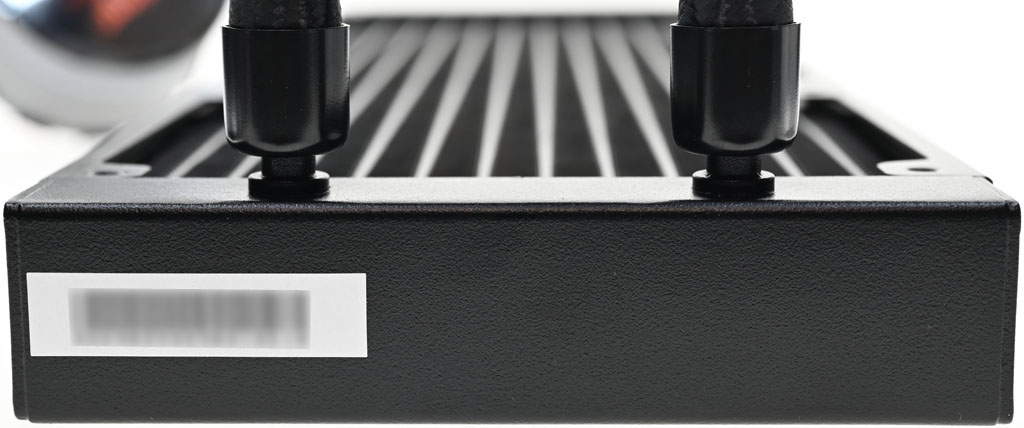 ▼鋁製水冷排尺寸392x121x27.5mm,進/出水管位於同一側,水管包覆黑色編織網,編織網部分長度37公分,直徑12.8mm,兩端金屬套管長度15mm