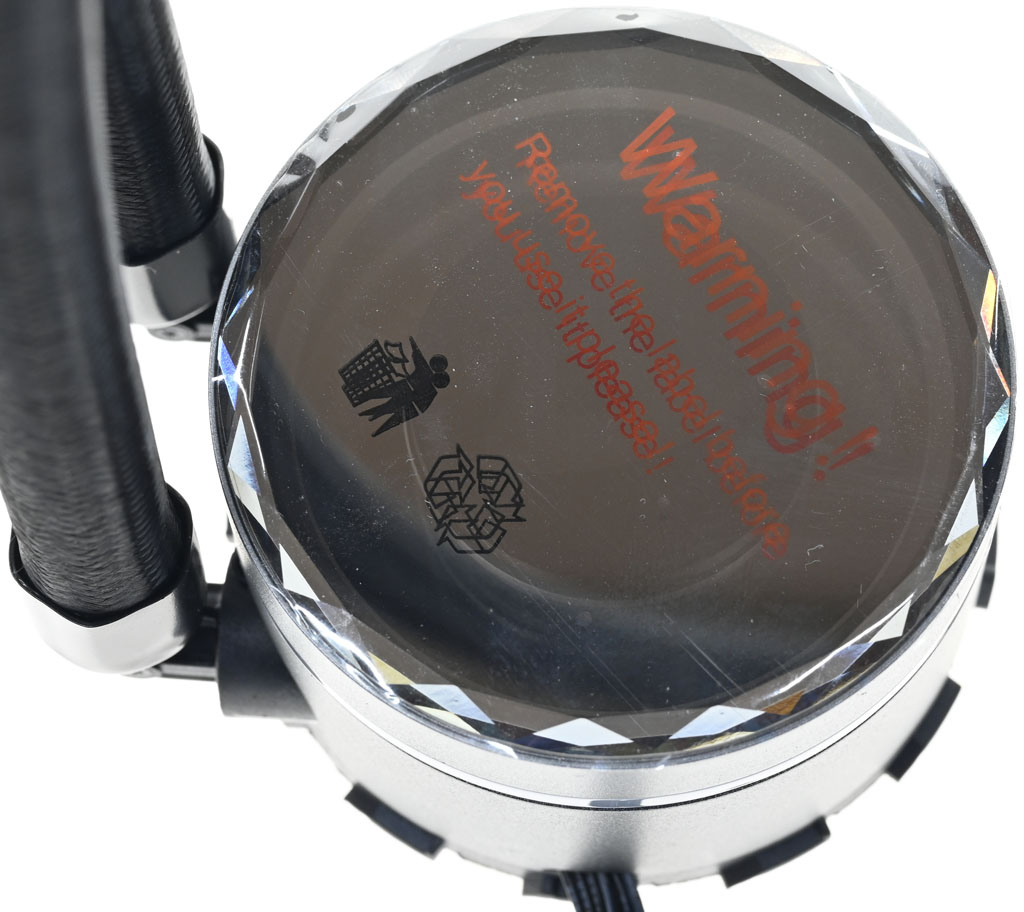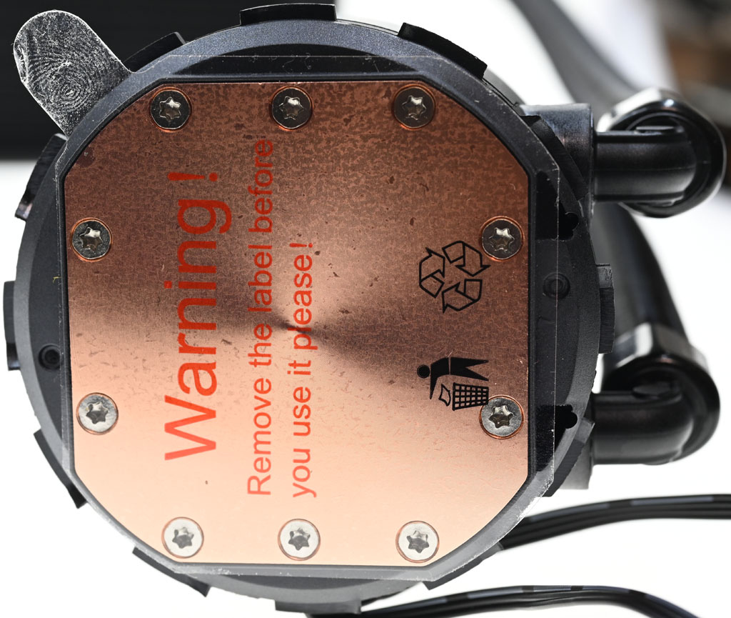 ▼水冷頭處理器接觸面有一層透明保護貼,上面印上”警告!請在使用前撕除!”英文