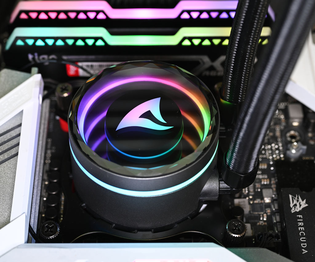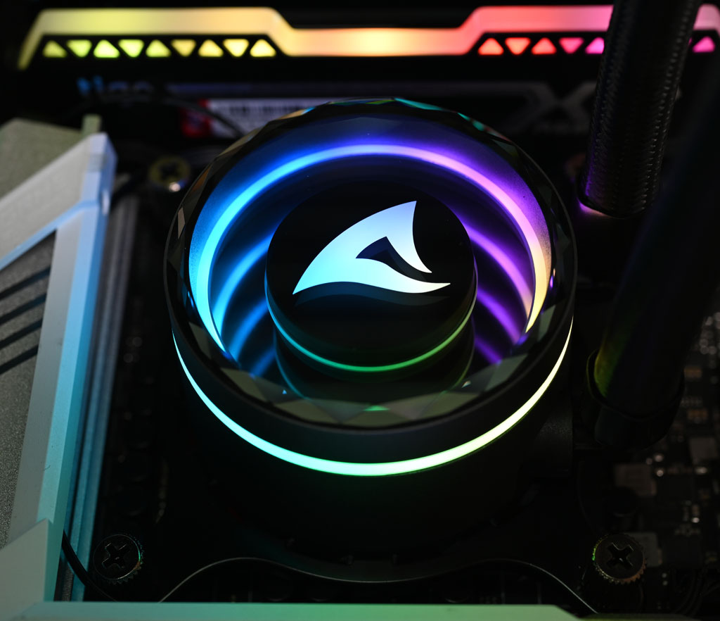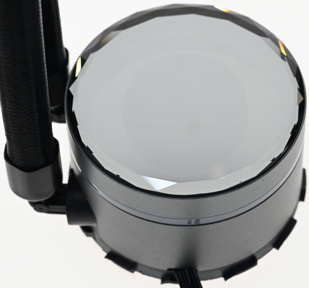●水冷頭頂部鏡面面板外圍有鑽石切割造型,搭配ARGB LED發光標誌、無限反射鏡及內外圍光環,塑造出獨特燈光效果