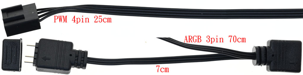 ▼水冷頭連接線組,幫浦PWM 4pin線路長度25公分,燈光ARGB 3pin母頭線路長度70公分,母頭至公頭線路長度7公分,公頭針腳有保護蓋