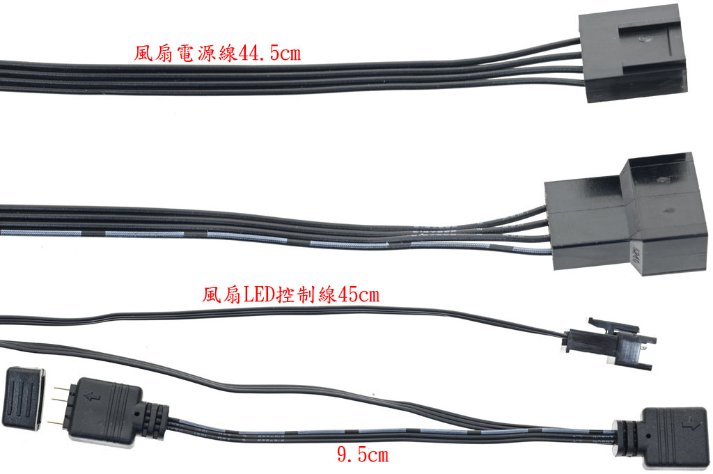 ▼風扇電源線(上)主機板端母頭到公頭線路長度44.5公分。風扇LED控制線(下)風扇端公頭到ARGB母頭線路長度45公分,ARGB母頭到ARGB公頭線路長度9.5公分,公頭有保護蓋