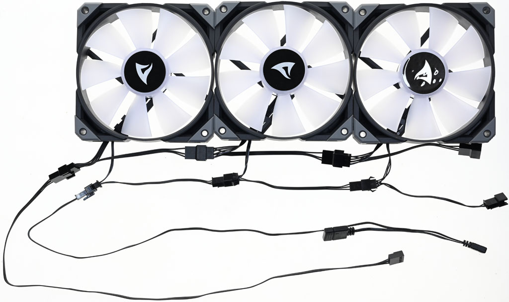 ●3顆幻彩RGB PWM風扇的轉速範圍600至2000RPM,外框螺絲孔處有包覆式防震膠墊,採用菊鏈串接設計,簡化線路,整線容易
