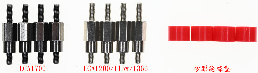 ▼LGA1700黑色螺柱(左)與LGA1200/115x/1366銀色螺柱(中)的外觀顏色及長度不同