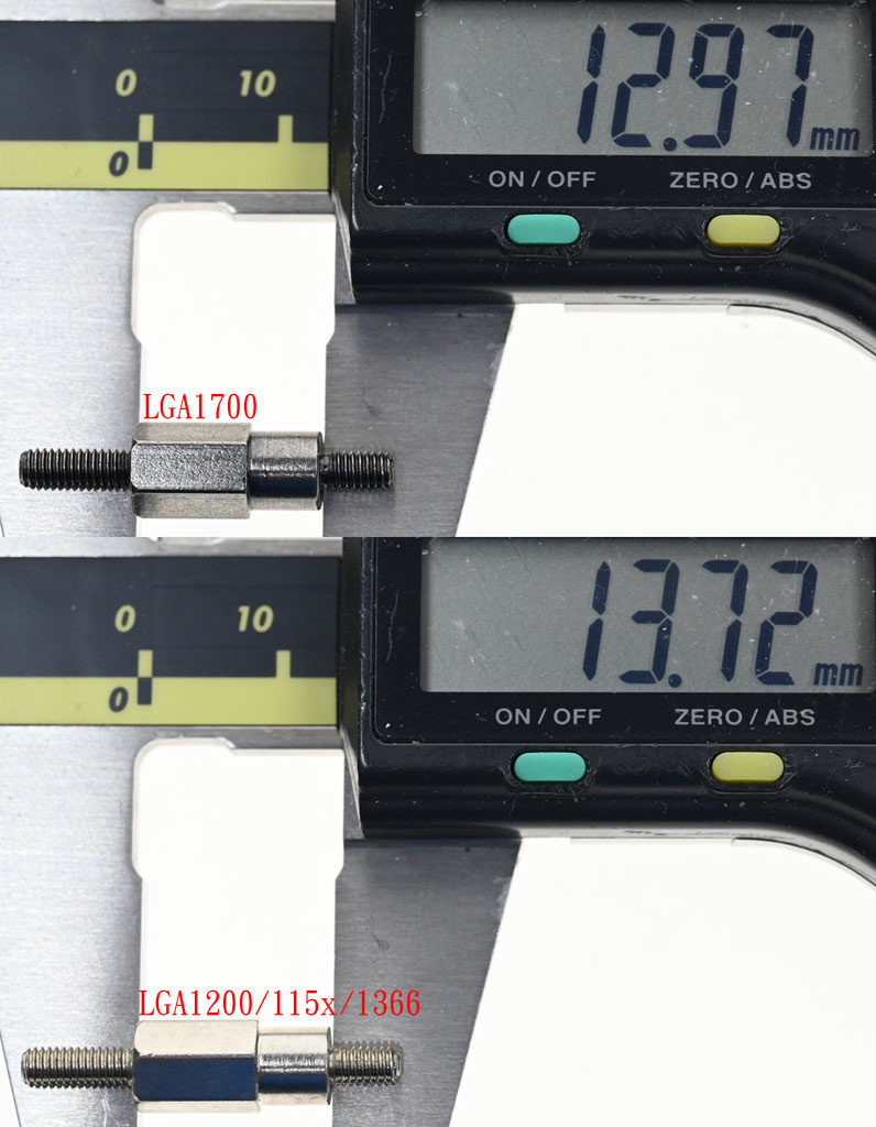 ▼LGA1700黑色螺柱(上)與LGA1200/115x/1366銀色螺柱(下)的長度比較