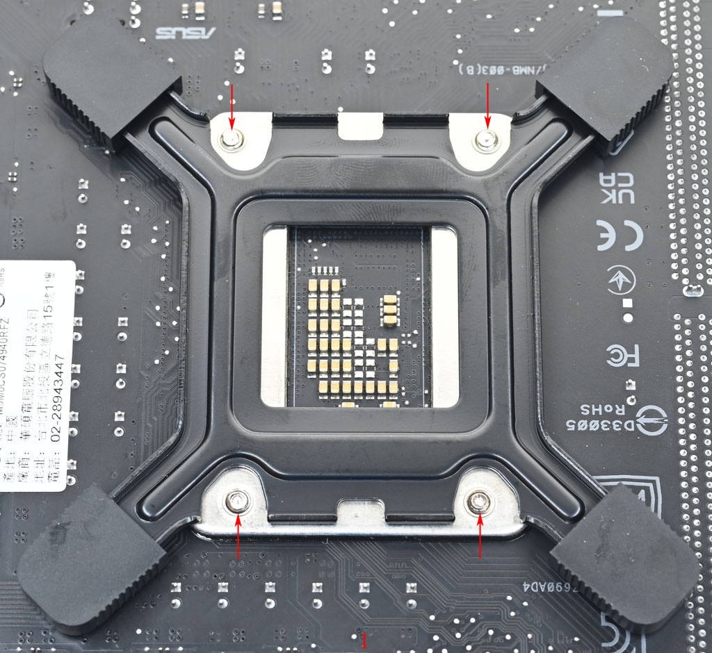 ▼安裝於LGA1200/115x平台時,將背板4支圓柱鎖點對準主機板背面散熱器孔位放入(圖1),如紅色箭頭所示,背板凹槽處需對準處理器扣具底板3個螺絲鎖點位置