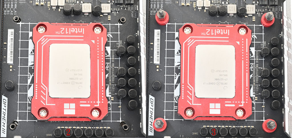 ▼背板正確安裝後,主機板正面散熱器孔位會露出4支高度相同的圓柱鎖點(圖2),把套上紅色矽膠絕緣墊的LGA1700黑色螺柱鎖入主機板正面露出的圓柱鎖點,將其轉緊到底且不鬆動即可(圖3)