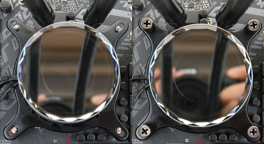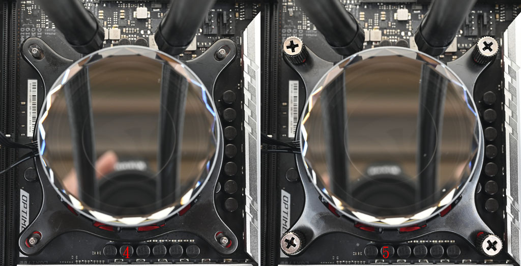▼安裝前先確認水冷頭的水管接頭不會與較高的元件(如VRM散熱片/記憶體)發生干涉。確認完成後取下水冷頭,將處理器表面清潔後塗上散熱膏,注意量不可過多或過少。放上水冷頭前要記得先撕除處理器接觸面保護膜,然後將Intel托架孔洞對準螺柱頂端套入(圖4)。鎖上4個手轉螺帽時,一開始先轉入數圈使其可以固定住,等到4個手轉螺帽都裝上後,採對角及輪流方式(轉幾圈後就換轉另一個)將4個手轉螺帽全部鎖到底(圖5)
