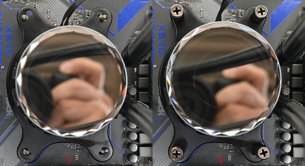 ▼安裝前先確認水冷頭的水管接頭不會與較高的元件(如VRM散熱片/記憶體)發生干涉。確認完成後取下水冷頭,將處理器表面清潔後塗上散熱膏,注意量不可過多或過少。放上水冷頭前要記得先撕除處理器接觸面保護膜,然後將AMD托架孔洞對準螺柱頂端套入(圖4)。鎖上4個手轉螺帽時,一開始先轉入數圈使其可以固定住,等到4個手轉螺帽都裝上後,採對角及輪流方式(轉幾圈後就換轉另一個)將4個手轉螺帽全部鎖到底(圖5)