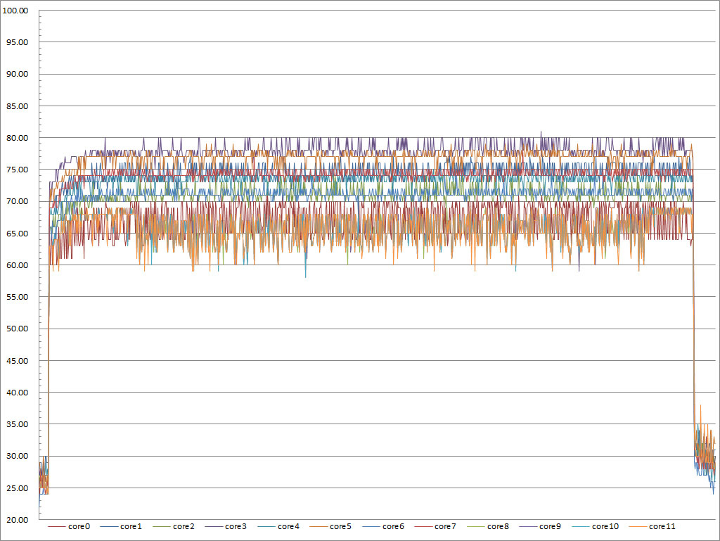 ▼高負載30分鐘的CORE TEMP溫度記錄圖