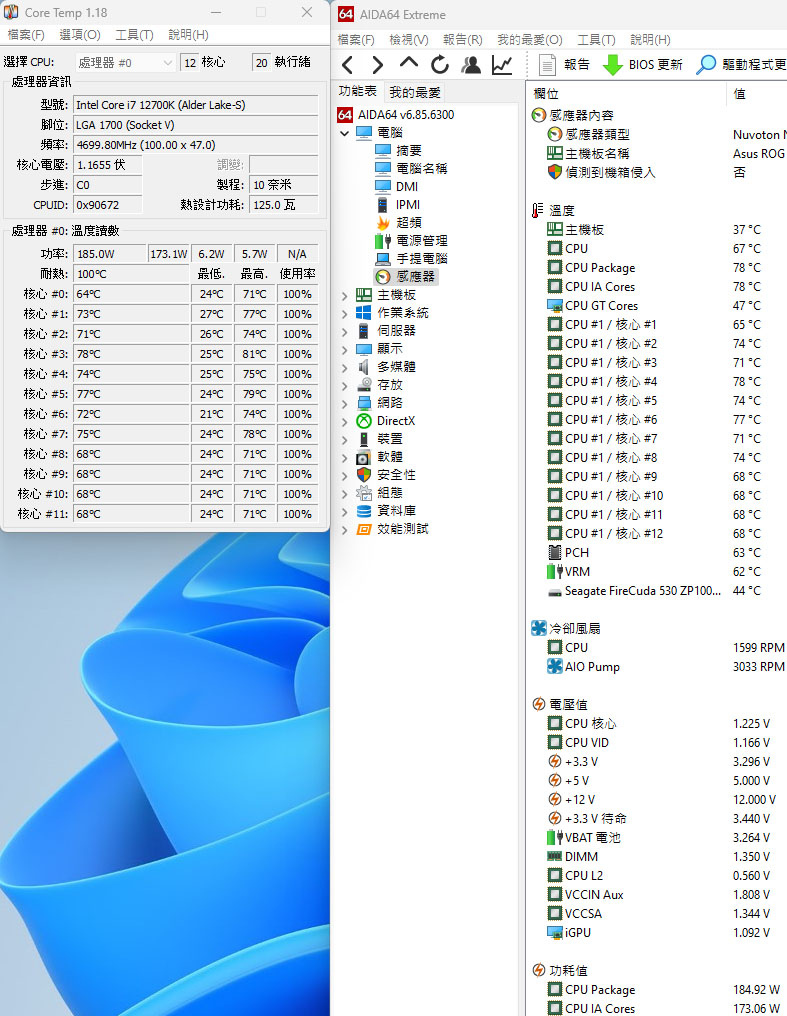 ▼高負載30分鐘的CORE TEMP及AIDA64感測器畫面