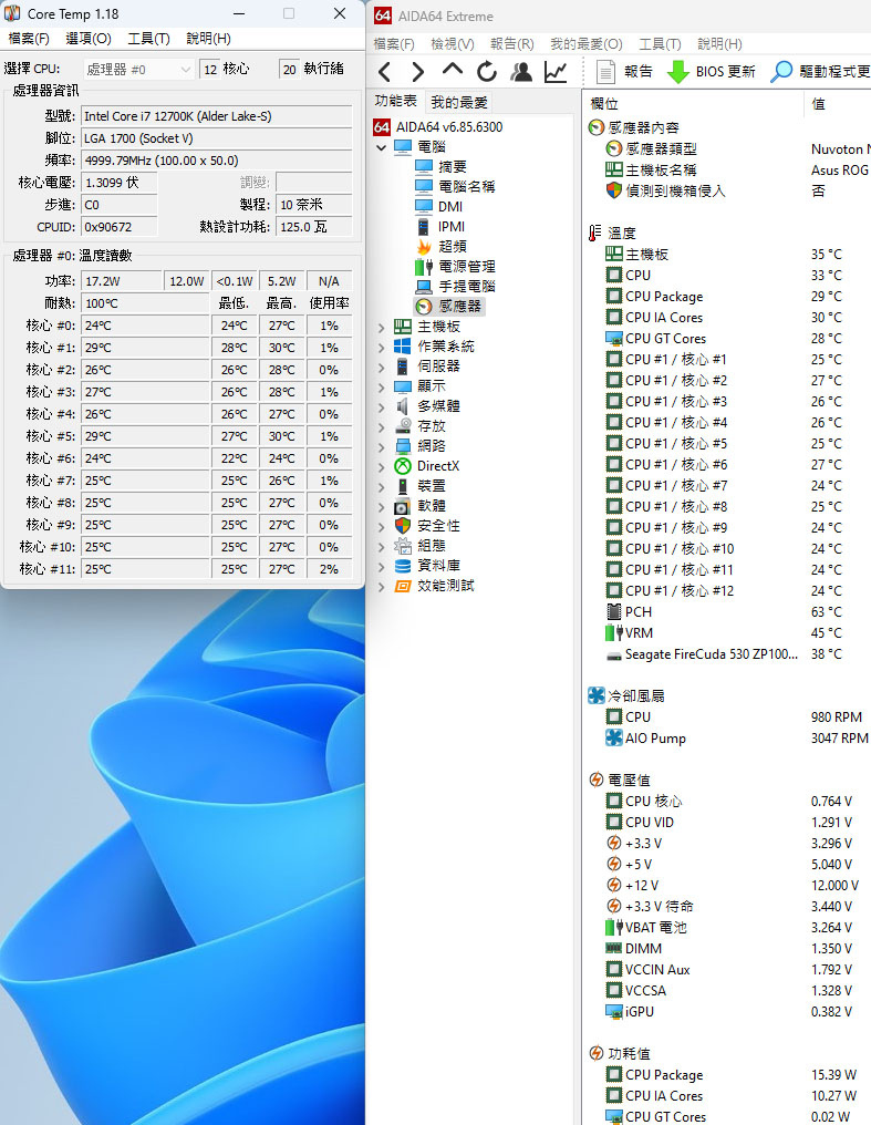 ▼待機的CORE TEMP及AIDA64感測器畫面