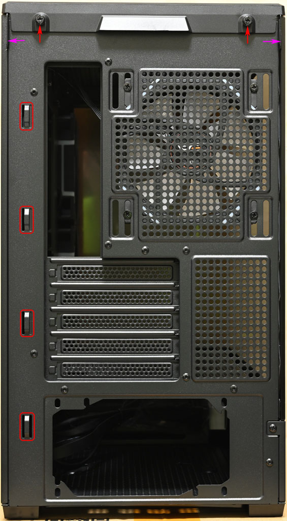 ▼機殼後方,最上面有打開左/右側板的凸出把手(紫色箭頭)及固定頂部蓋板的手轉螺絲(紅色箭頭),右上方通風口可裝1個120/140mm風扇。下方電源供應器安裝位置提供2種安裝方向孔位,靠近I/O擋板、擴充槽及電源附近有4個整線固定支架(紅框)