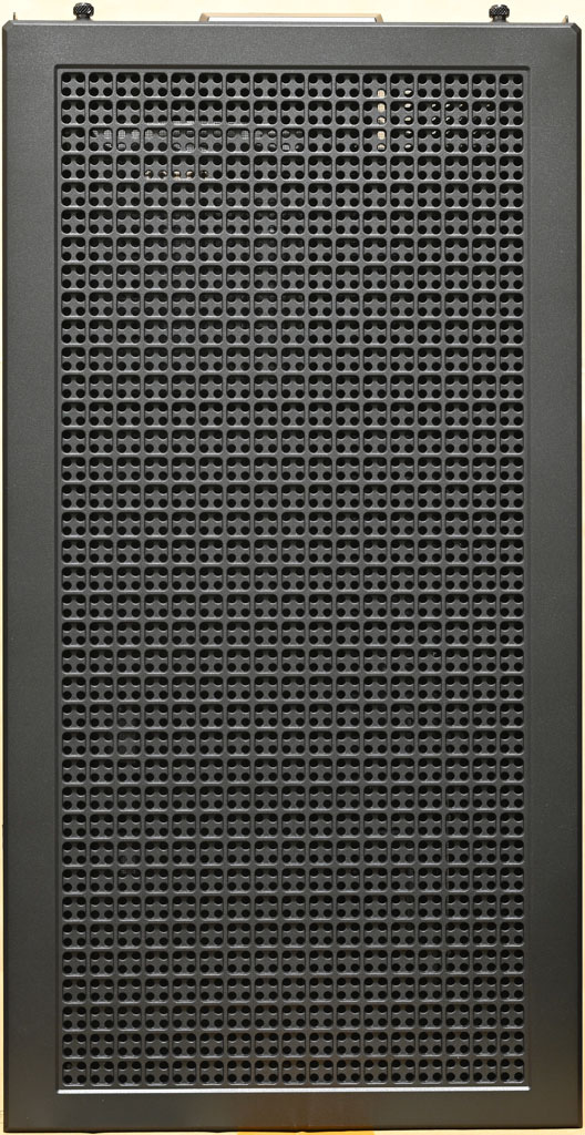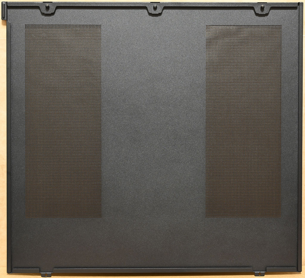 ▼右側前方風扇安裝位置為網狀設計,中間有長方形開口,長條形固定孔可安裝2個120mm風扇