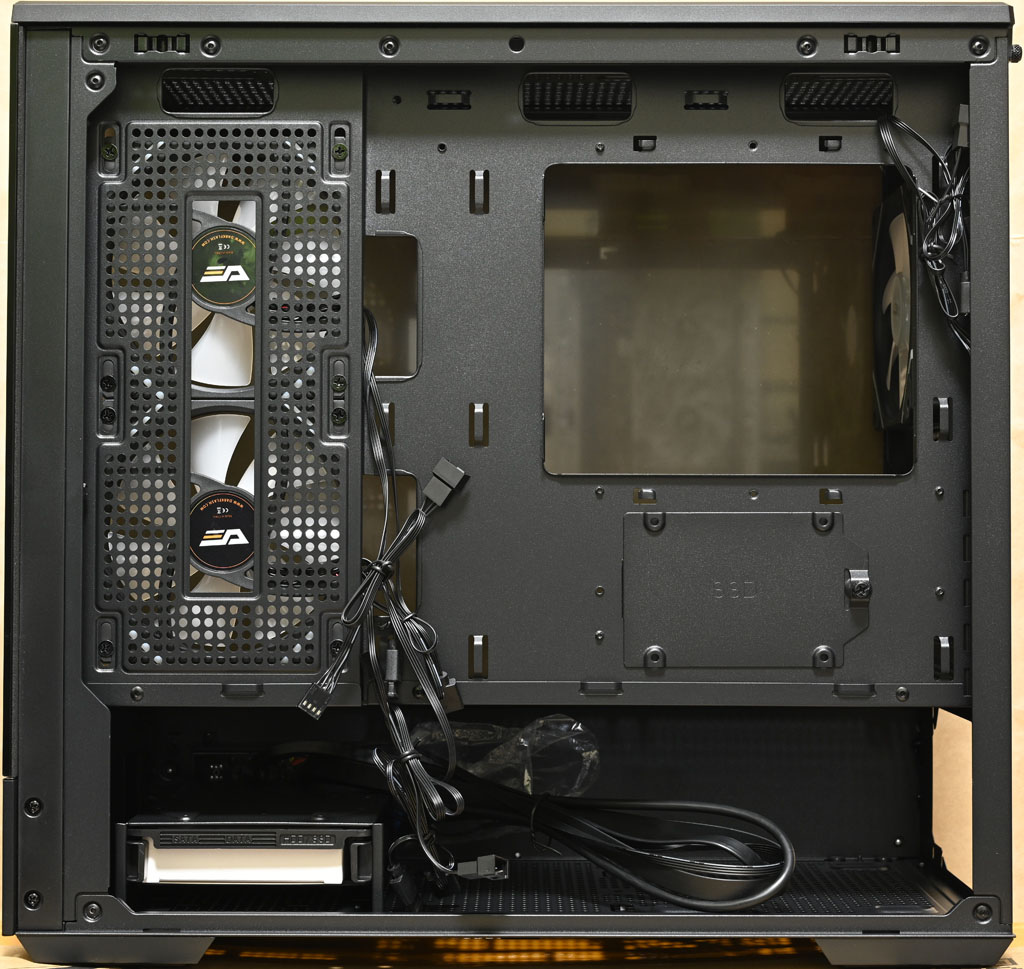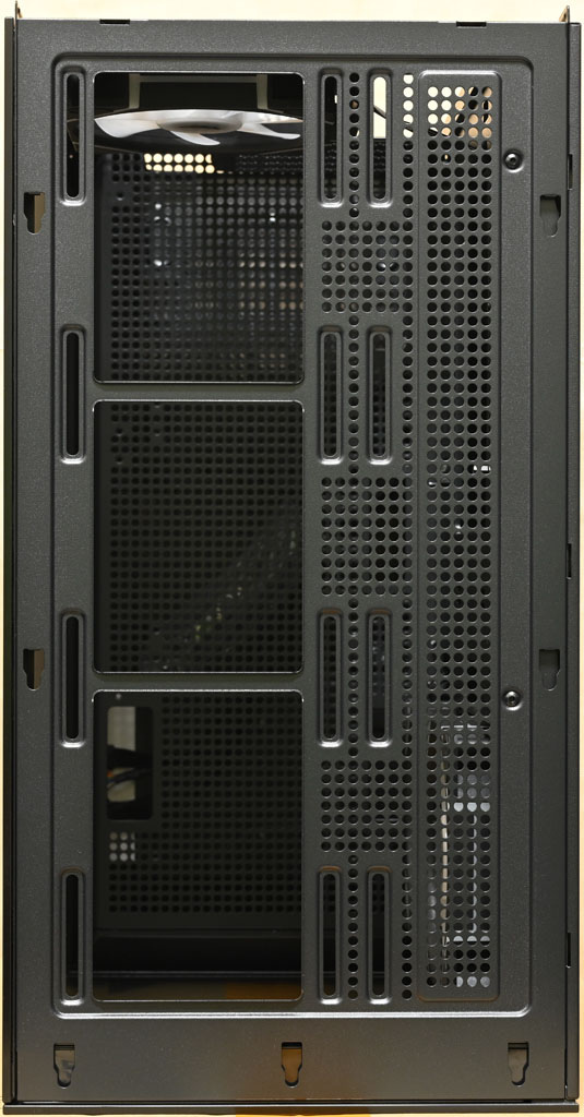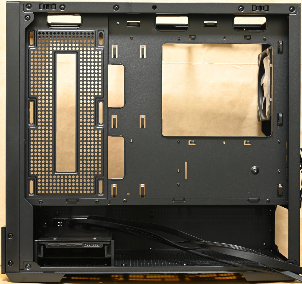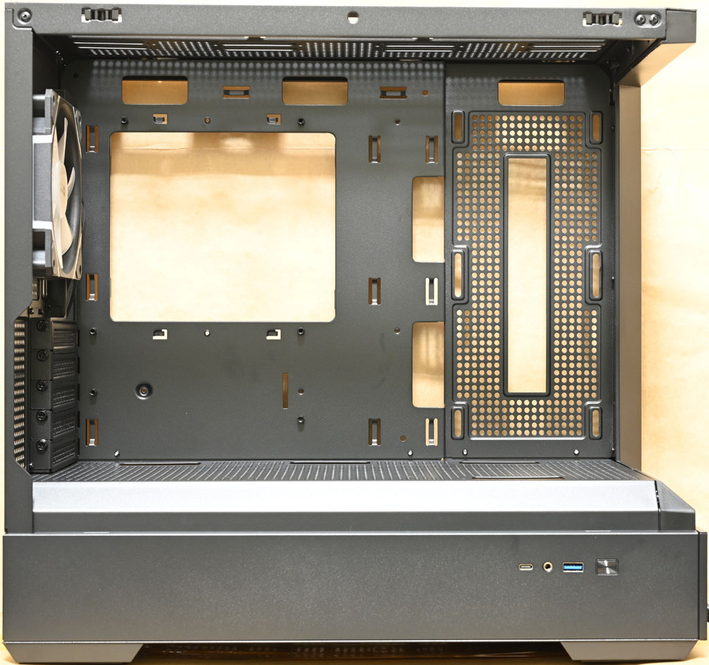 ▼機殼左側配置,主機板/介面卡安裝區與電源艙採隔離設計,底板最上方有3個長方形穿線開口,底板右側前方風扇旁有2個長方形穿線開口