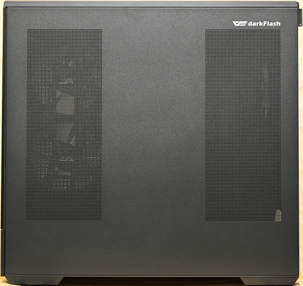 ▼右側板的右上有商標,配置高密度網狀通風口,採卡榫固定,拆卸免用工具,從機殼後方頂部側板凸出把手施力往外拉開(注意扳開角度不可過大),待上方球狀卡榫全部鬆脫後,將側板往上提,使下方插入卡榫脫離固定槽