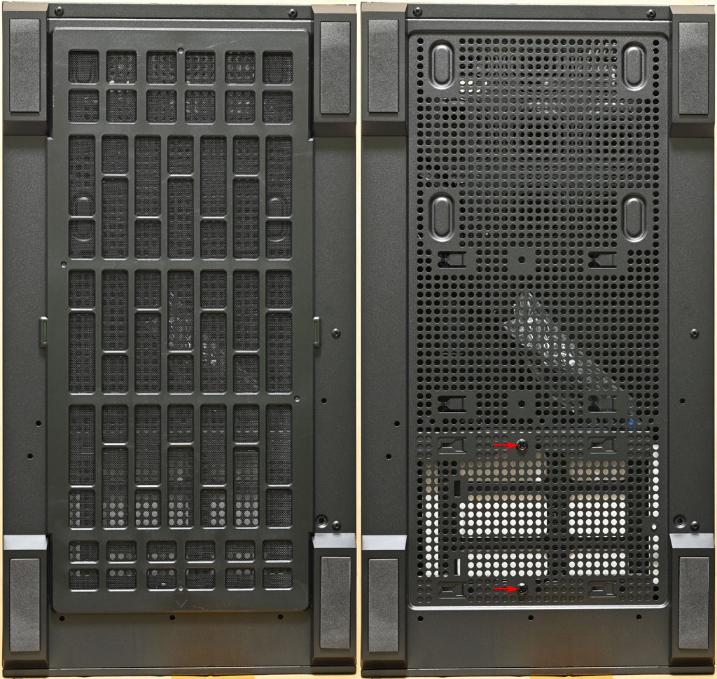 ▼機殼底部方形腳座有防滑墊,底部通風口配置磁吸式過濾網,紅色箭頭為底部固定架的螺絲
