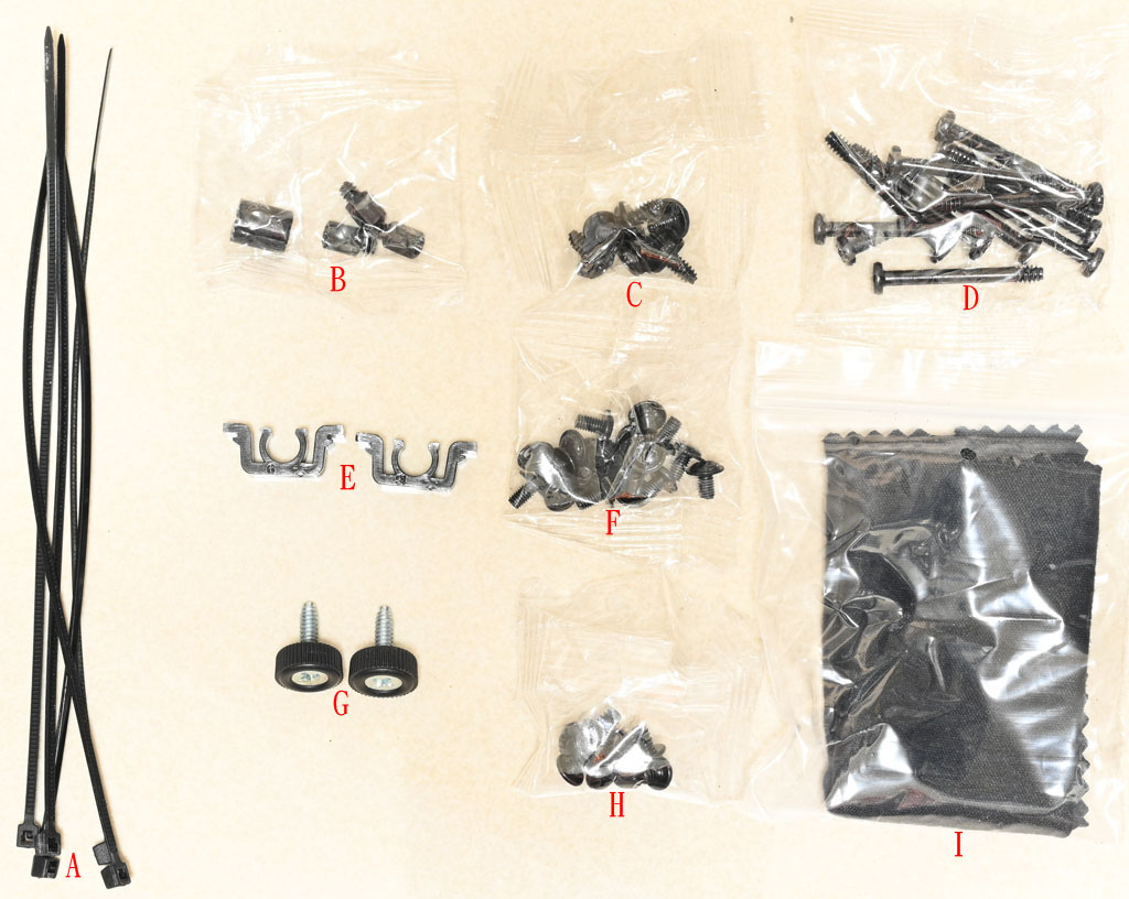 ▼零件整理盒內有塑膠束帶(A)、主機板銅柱/套筒工具(B)、電源/介面卡螺絲(C)、風扇固定長螺絲(D)、備用球狀卡榫卡扣(E)、主機板銅柱/2.5吋螺絲(F)、手轉螺絲(G)、3.5吋螺絲(H)、擦拭布(I)
