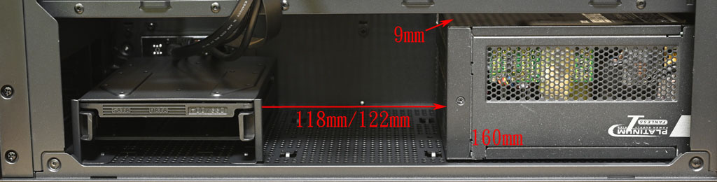 ▼安裝長度160mm的電源供應器後,固定架右側與電源供應器左側距離118mm(固定架開口邊緣)/122mm(固定架側面),電源供應器頂部與電源艙頂部距離9mm